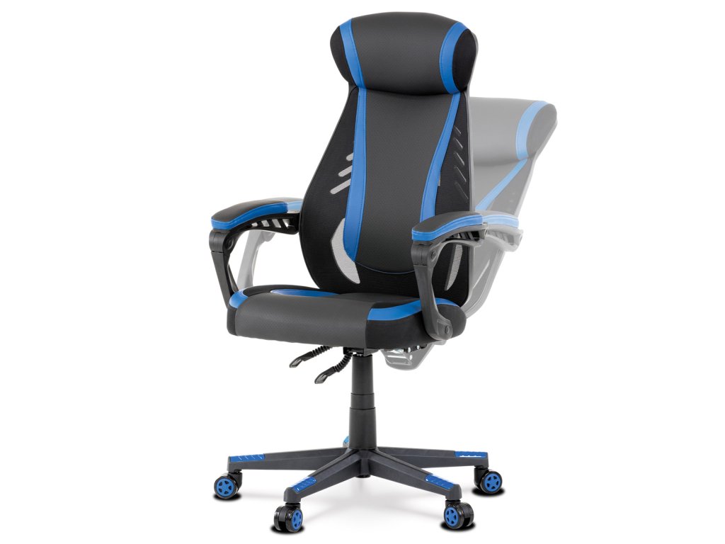 Luxusní herní a kancelářské křeslo z kolekce TOP racing. Jedná se o moderní designové křeslo, navržené nejen pro náročné požadavky PC hráčů, ale je uzpůsobené i pro standardní kancelářskou práci. To vše v maximálním pohodlí a při dokonalé ergonomii sezení. Potah je kombinací modré a černé perforované ekokůže na sedáku i opěráku, černé síťoviny MESH a černé, jemně hrubé látky látky na sedáku i bocích opěrky hlavy. Opěrák je černý plastový výlisek ve futuristickém designu. Výplň sedáku i hlavové opěrky je z velmi kvalitní a tuhé PU pěny, vyztužení a pružnost zajišťují látkové popruhy. Křeslo je vybaveno permanent contact mechanismem s plynulou aretací. Při vypnutí je možné se s opěradlem volně pohupovat. Výška sezení se upravuje jednou páčkou na pravé straně přes kvalitní plynový píst. Poloha opěráku se nastavuje druhou páčkou, umístěnou rovněž na pravé straně křesla. Masivní černý plastový kříž s modrými protiskluzovými plastovými doplňky je osazen černými plastovými kolečky pr. 6 cm s modrým racing středem a gumovým obvodem ideálními na tvrdé podlahy. Se stabilitou celých 70 cm průměru kříže si můžete dovolit i ty nejnáročnější hry. Vysoký, prodyšný a ergonomicky navržený opěrák s integrovanou zesílenou opěrkou hlavy, polstrovanou a výškově nastavitelnou bederní opěrkou slouží nejen jako výborná opora celých zad a také podporuje správné držení páteře. Područky jsou plastové, polstrované a potažené modrou a černou ekokůží. Šíře je 7 cm, délka ložné plochy 33 cm a výška 3 cm. Při sklápění sedáku se pohybují a kopírují jeho pohyb a polohu.