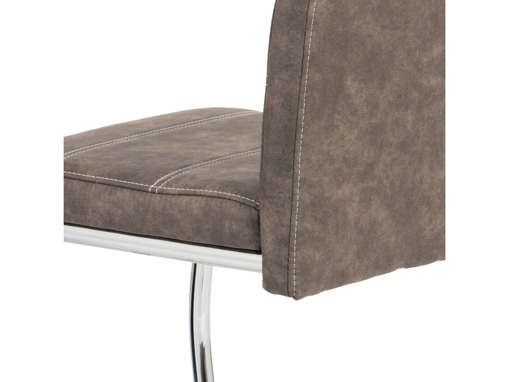 Jídelní židle v moderním stylu. Potah hnědá látka COWBOY v dekoru vintagekůže, s bílým horizontálním prošitím sedáku a opěráku. Kovová pohupová chromovaná podnož. Nohy jsou kruhového průřezu a ukončené plastovými kluzáky. Nosnost židle je 110 kg.Doplňkové parametry