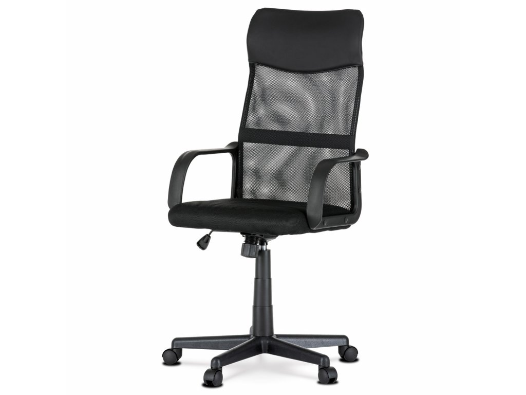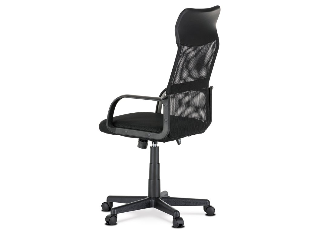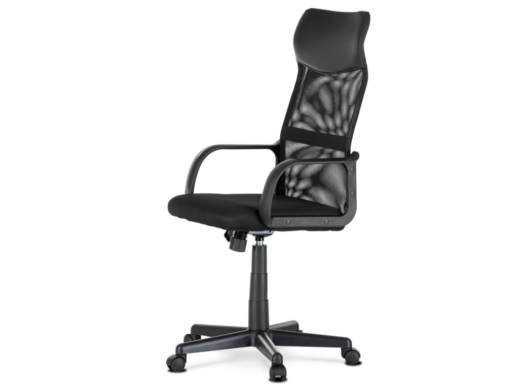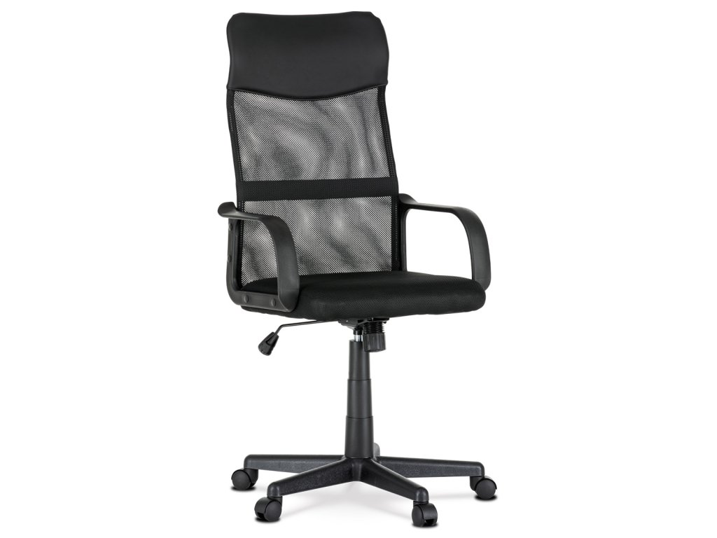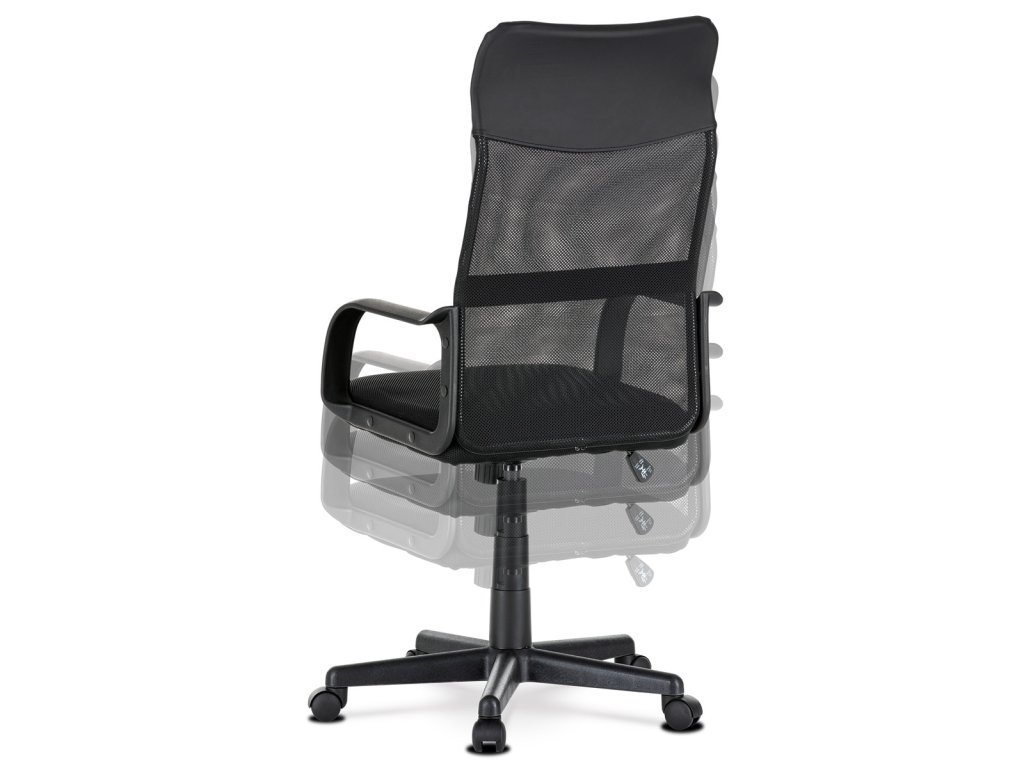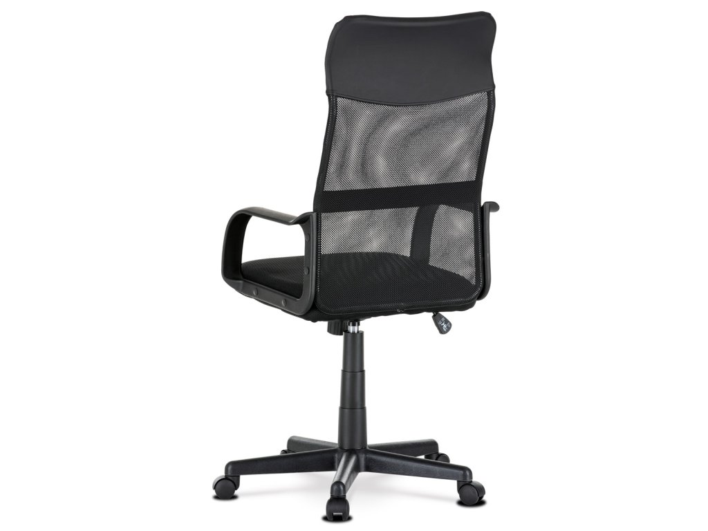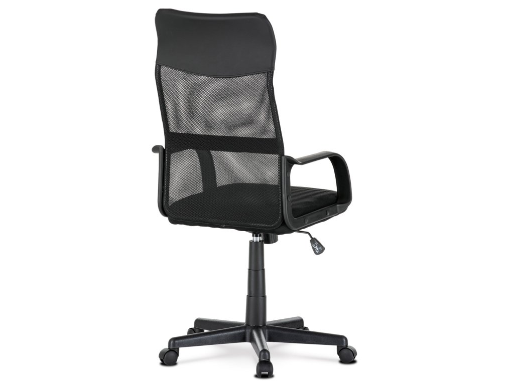 Oblíbená a nadčasová kancelářská židle decentní černé barvy je vhodná nejen do kanceláří, ale například i pro Home office. Vysoký trubkový opěrák s bederní opěrkou je potažen černou síťovinou MESH a v horní části jako podhlavník slouží velmi praktický potah z černé ekokůže. Použité materiály na sedáku i zádové části opěráku zaručují dokonalou prodyšnost. Příjemný polstrovaný sedák je potažený černou látkou MESH. Výplň je v kvalitní PU pěny, která zaručuje příjemné dlouhodobé sezení. Ruce si můžete pohodlně opřít o 6 cm široké černé plastové područky s velkou ložnou plochou 35 cm. Područky zároveň slouží jako velmi pevné spojovací díly sedáku s opěrákem. Díky kvalitnímu plynovému pístu je židle výškově nastavitelná, vybavená houpacím mechanismem a velkým aretačním šroubem na úpravu tuhosti pohupu, který je umístěn pod sedákem. Správnou stabilitu a pevnost zajišťuje pětiramenný černý plastový kříž o pr. 60 cm s plastovými kolečky vhodnými na koberce.
