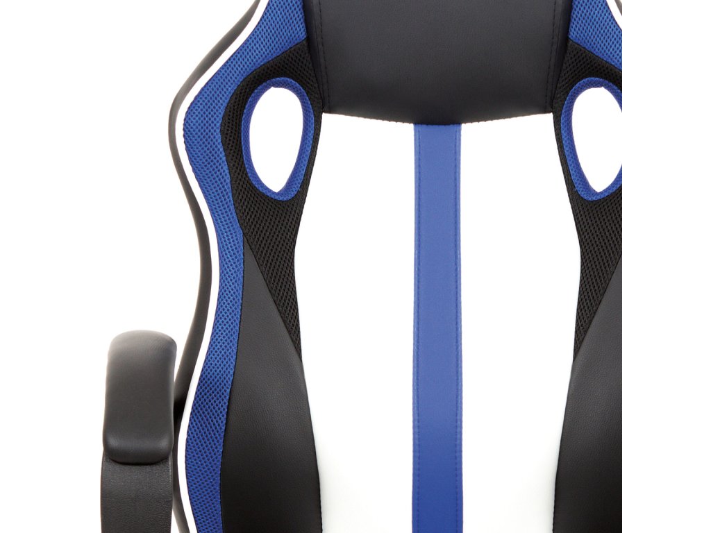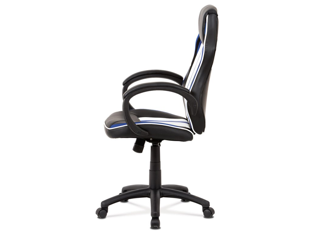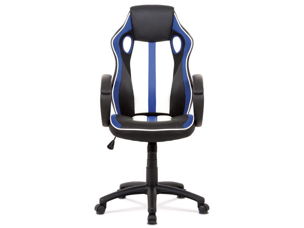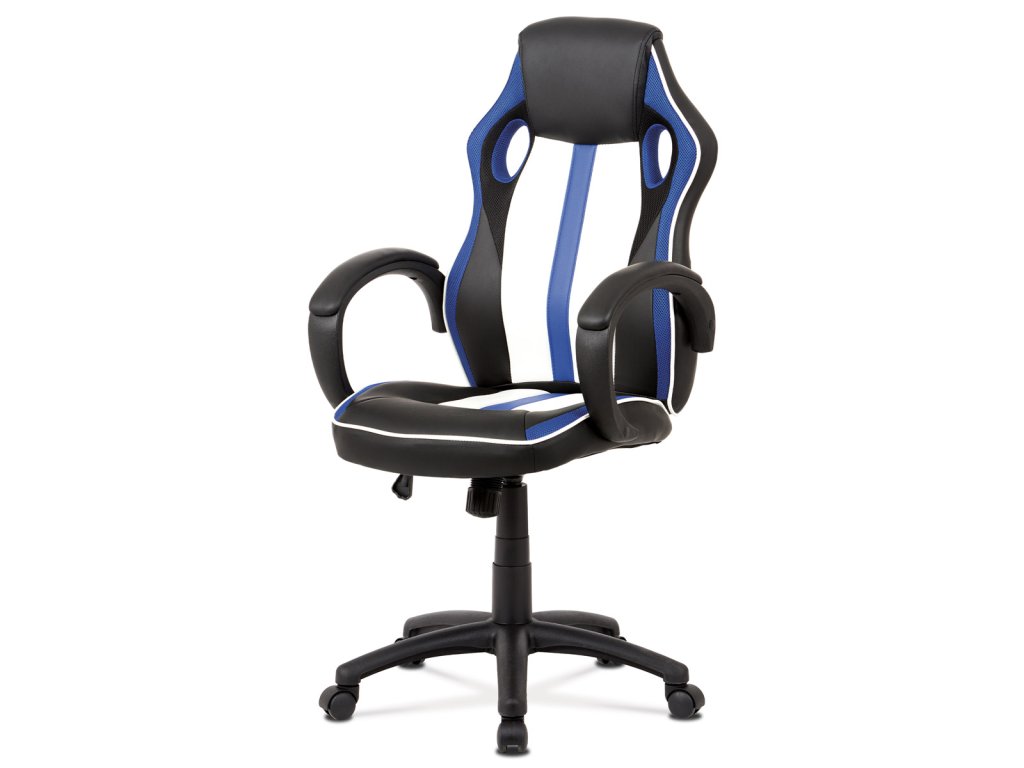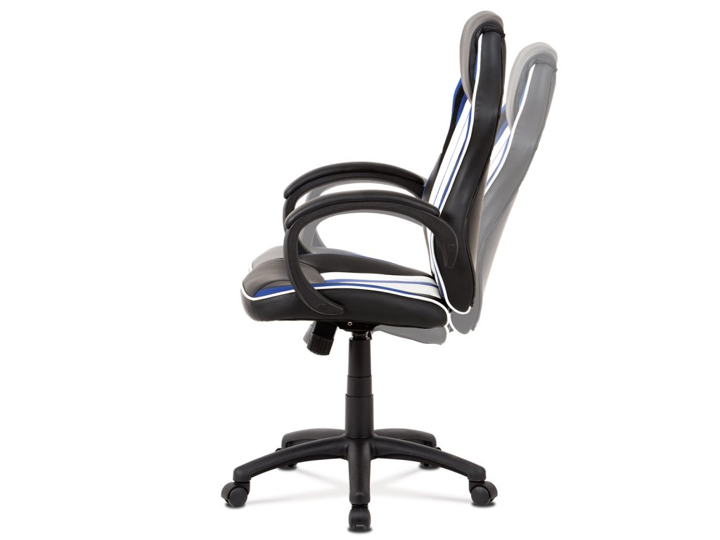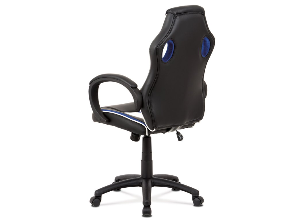 Studentská kancelářská židle inspirovaná stylem závodních vozů, kterou jistě ocení nejen závodní nadšenci, ale také začínající hráči. Díky kvalitnímu pístu je výškově nastavitelná, s houpacím mechanismem, zesíleným černým plastovým křížem a plastovými kolečky vhodnými na koberce. Tuhost pohupu lze regulovat velkým plastovým šroubem, který se nachází pod sedákem. Sedák a opěrák jsou čalouněné černo-bílou ekokůží a modro-černou látkou MESH. Opěrák má dva průřezové otvory čalouněné modrou látkou MESH, které nejen že dodávají židli potřebný závodní vzhled, ale také usnadňují manipulaci s židlí. Pevné plastové područky černé barvy, které jsou polstrované a čalouněné černou ekokůží vytváří dokonalé podmínky pro hraní.