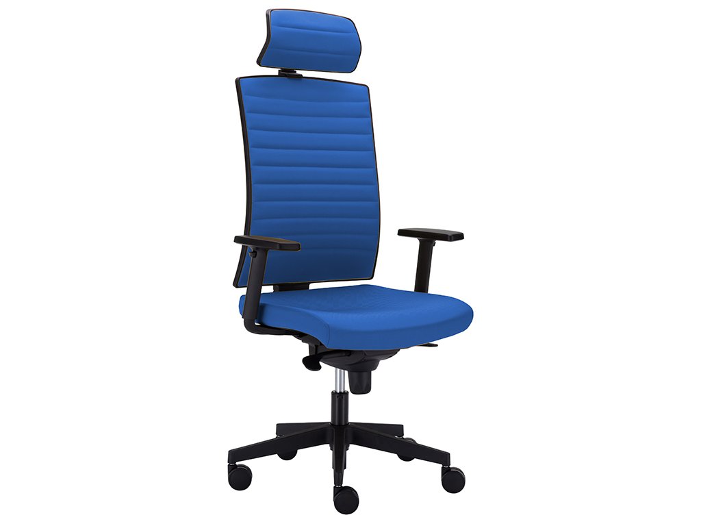 Židle do kanceláře s vysokým opěrákem a výškově stavitelnou hlavovou opěrkou, která je rovněž čalouněna textilií. Židle stojí na plastovém kříži osazeném kolečky na koberce. Chcete-li židli používat na tvrdých podlahových krytinách jako je lino, PVC, plovoucí podlaha apod. zvolte kolečka určená na tvrdé podlahy.