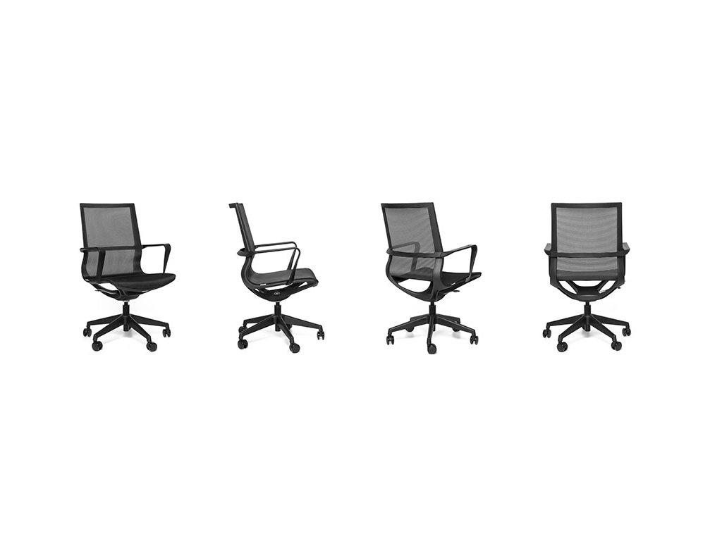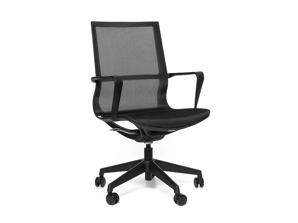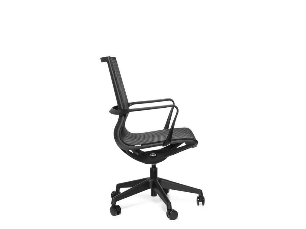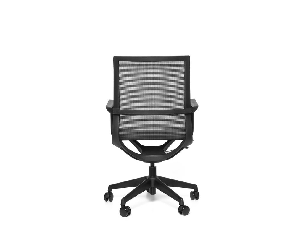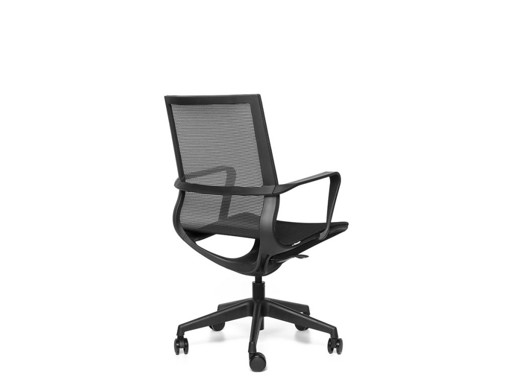 Středně vysoký ergonomicky tvarovaný opěrák , korpus z tvrzeného plastu s prodyšnou kvalitní síťovinou, pevné područky, mechanismus s možností nastavení tuhosti odporu houpání, nylonový kříž, univerzální kolečka Ø 60mm, barevné provedení: černá, váha židle 10, 2 kg