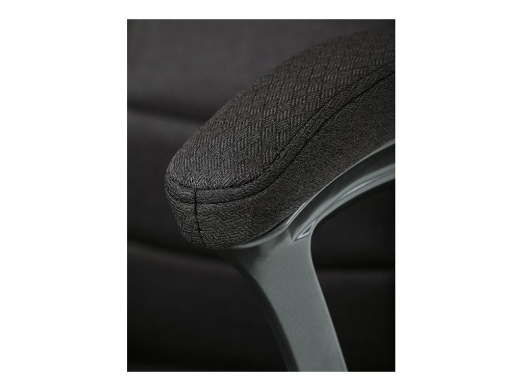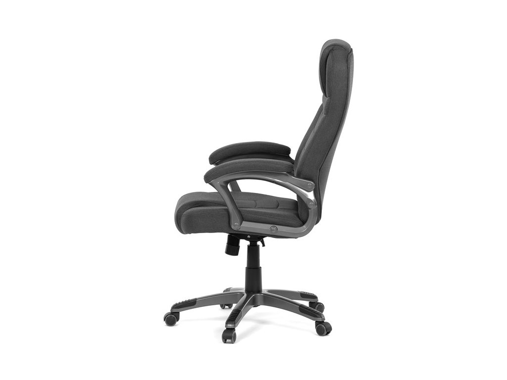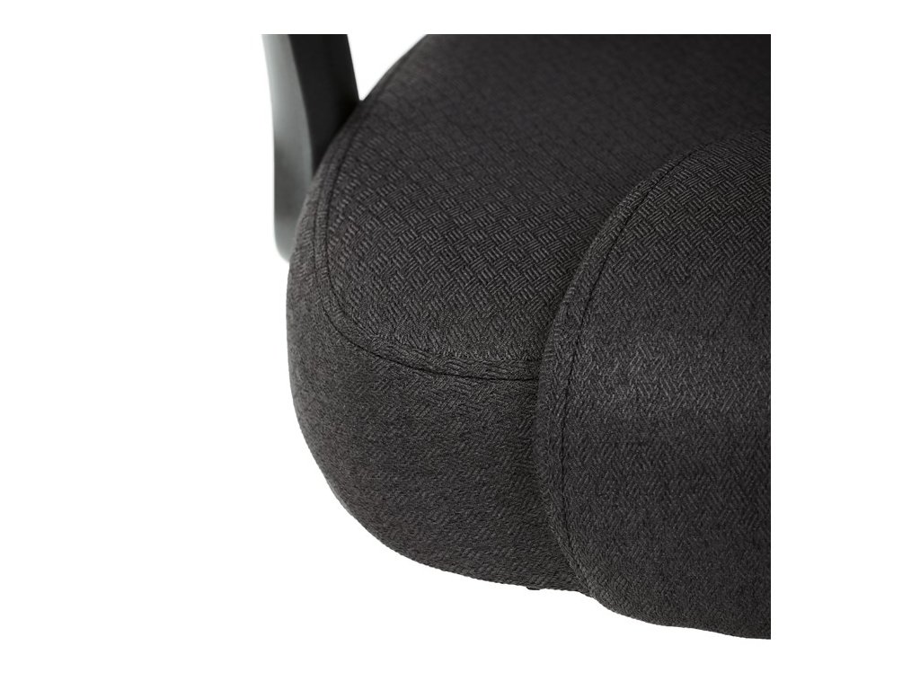 Kancelářské křeslo v černé látce nabízí vysoký opěrák s pevnou opěrkou hlavy a vyměkčenou vrchní částí pro zvýšený komfort při dlouhodobém sezení. Pevné čalouněné područky jsou integrovány do šedého plastového rámu, který spolu s plastovým křížem zajišťuje stabilitu a lehkost. Houpací mechanismus umožňuje příjemné naklánění s možností aretace v základní poloze, zatímco výškově nastavitelná sedací plocha umožňuje přizpůsobení výšky podle potřeby uživatele. Kolečka jsou vhodná pro tvrdé povrchy, což zajišťuje snadný pohyb bez poškození podlahy.